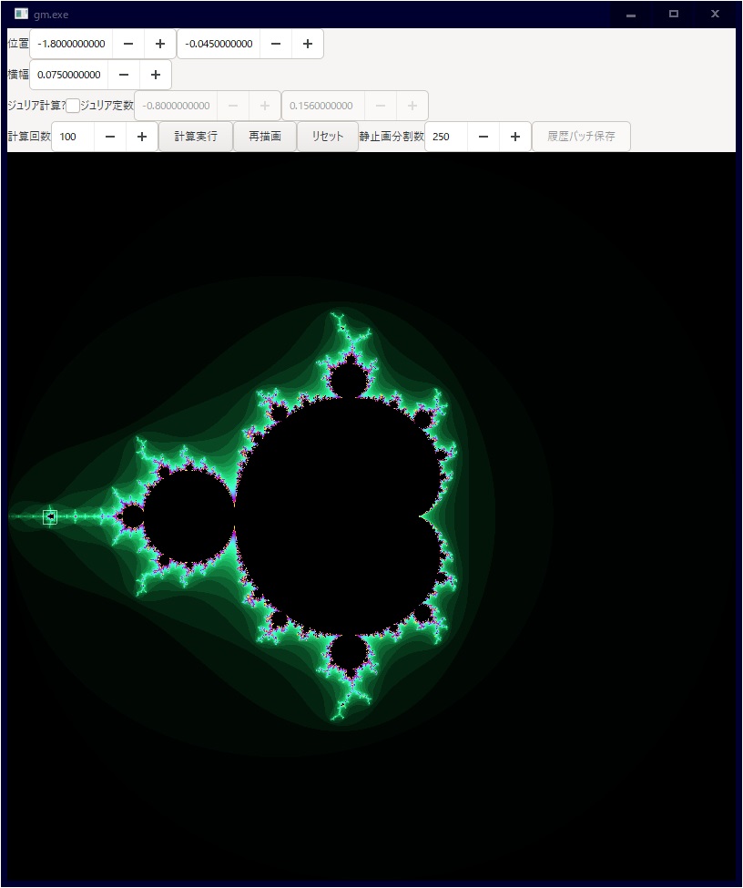 GUI操作用のgm.exeから探索履歴を元に連続静止画作成用バッチファイルを出力できるようにした。(マンデルブロ集合専用だけど。)