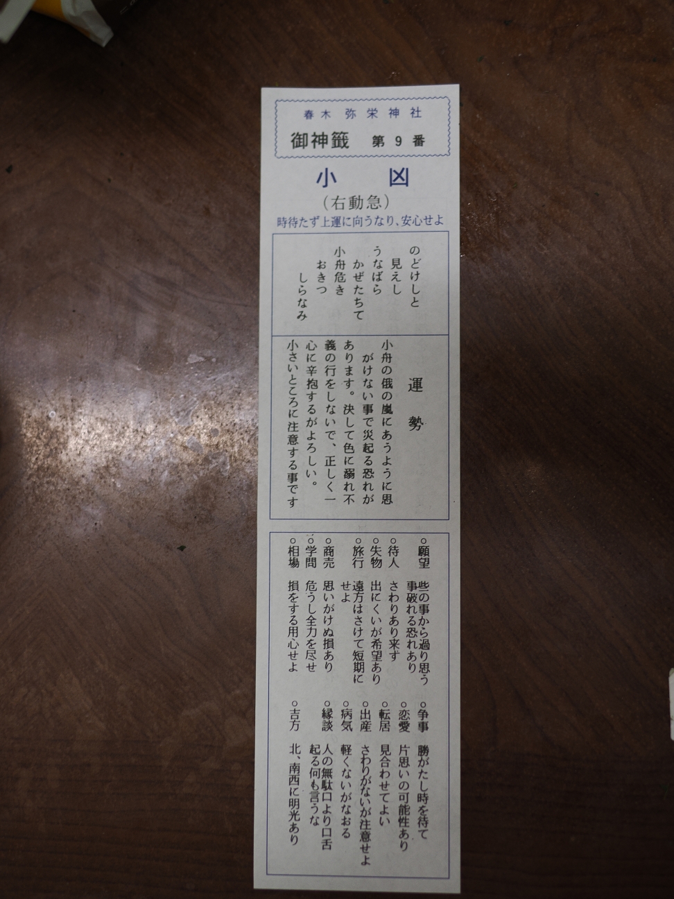 初詣で引いたおみくじが小凶なんて悲しいけど、まだ上向きなのが救いかな。